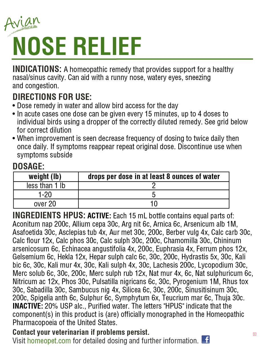 HomeoVet’s Avian Nose Relief is a homeopathic remedy that provides support for a healthy nasal and sinus cavity. Can aid with a runny nose, watery eyes, sneezing, and congestion in backyard chickens, show chickens, and other poultry.